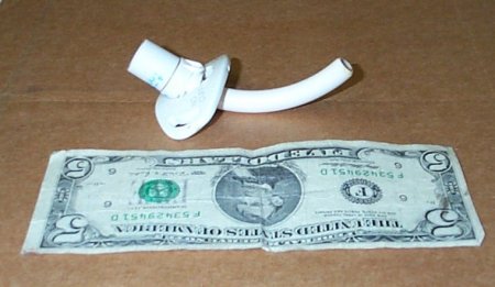 Shown below are photos of a trach tube, next to a five dollar bill for size comparison.
